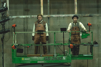 Joining the audience from outside the space, lunchboxes in hand, two Gravediggers stepped atop the cherry picker and motorized themselves in the air thirty feet. They were both vulnerable, heartbreaking, funny and - as they dug - lowered themselves, scene by scene, to the ground. They carried us through the story, page by page. The "dirt" was typed pages of the script itself that floated to the floor as they dug.